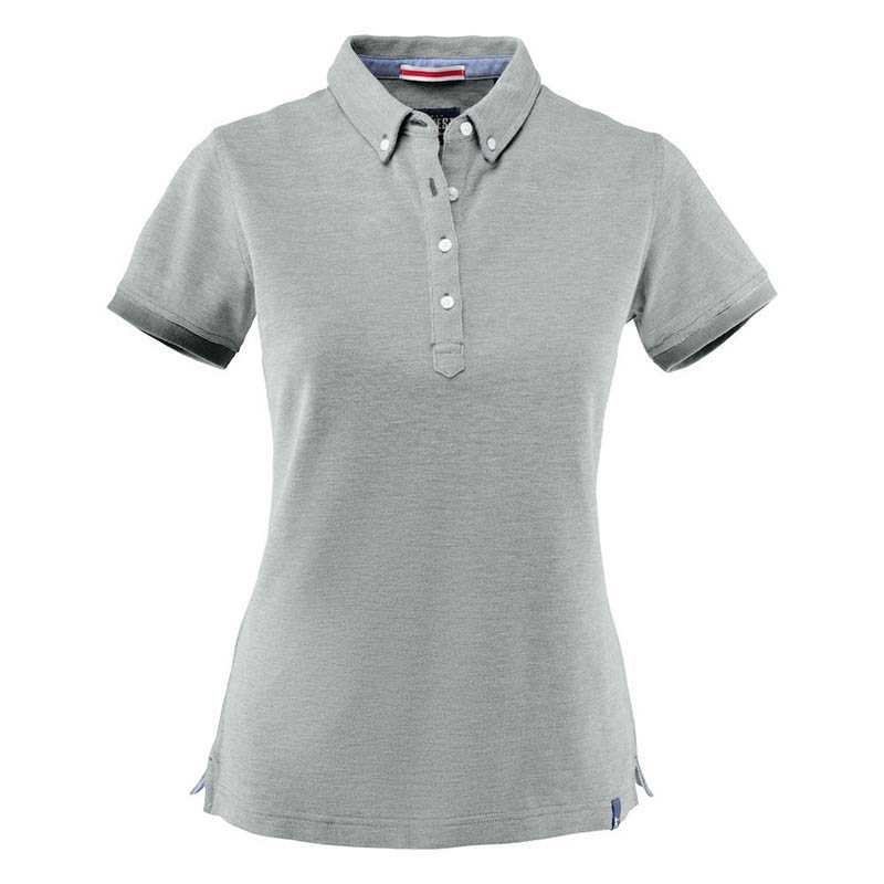 Ladies' polo pique in stretch quality made of organic Fairtrade cotton with elements of elastan for a better fit. Shaped v-neckline, ribbed collar and cuff, straight sleeve and stitch