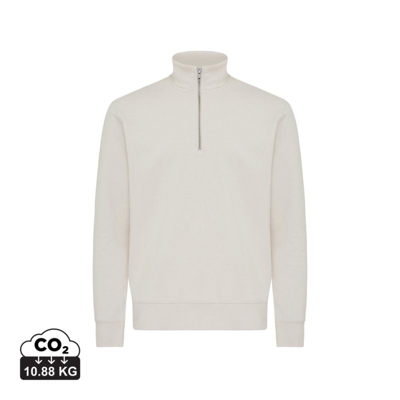 NOVINKA 2025 XMASS. Moderný unisex sveter s krátkym zipsom vyrobený zo 100 % bavlny – 30 % recyklovanej a 70 % organickej, s gramážou 300 g/m2. Sveter má golier z rovnakého materiálu, dlhé vsadené rukávy a rebrovanie 1x1 na manžetách a spodnom leme. Vnúto