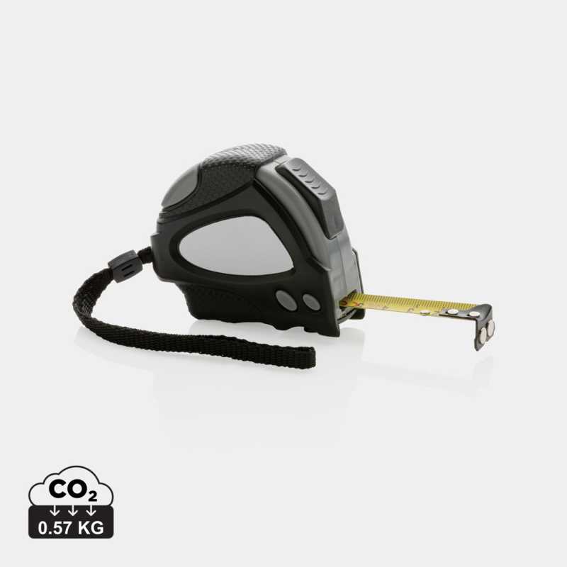 Zvinovací meter s dĺžkou 5 m vyrobený z RCS recyklovaného ABS plastu. RCS (Recycled Claim Standard) je globálny štandard, ktorý umožňuje overiť použitie recyklovaného materiálu v produkte naprieč celým dodávateľským reťazcom. Celkový podiel recyklátu podľa váhy produktu: 15%. 19 mm široké žlté pásmo s oceľovým háčikom a 2 integrovanými magnetmi. TRP pogumovaná úprava pre pohodlný úchop, pútko na zápästie, tlačidlo na uzamknutie/uvoľnenie. Balené v FSC® kraftovej darčekovej krabičke.
