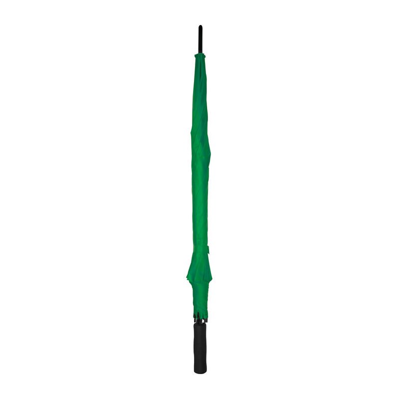 Umbrella with automatic telescopic springs. 190T polyester canopy, fibreglass frame, metal stem, soft foam handle and velcro closure.