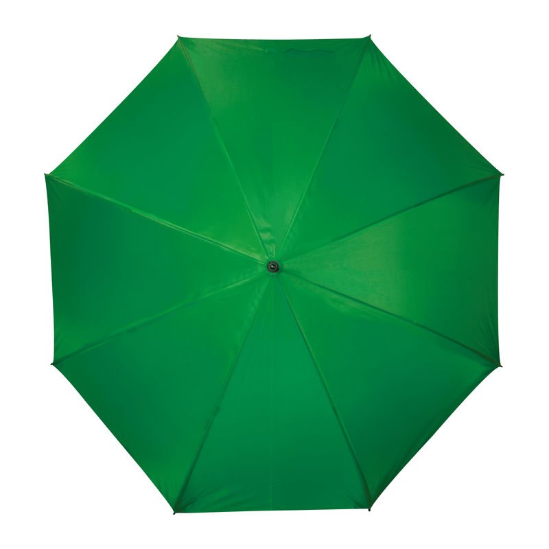 Polyester (190T) golf umbrella with eight panels. Metal frame and wooden handle.