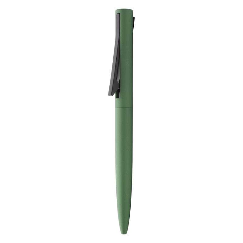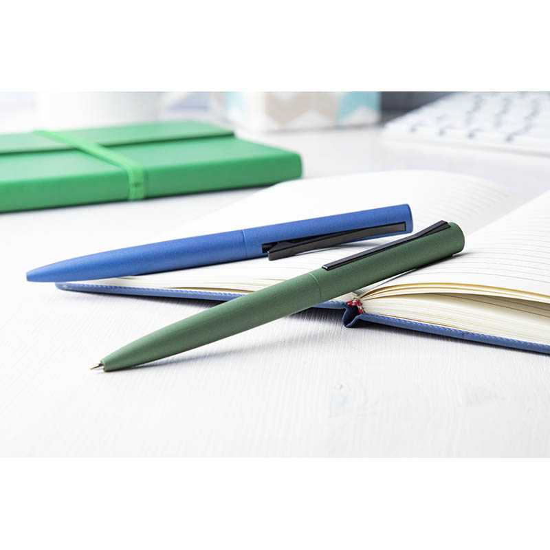 Guľôčkové pero z recyklovaného hliníka v matnej metalickej farbe s hornou časťou z recyklovaného ABS a špeciálnym klipom. S modrou náplňou.
