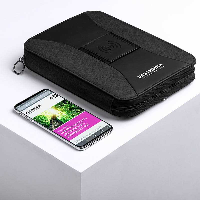 NOVINKA 2025. All in one power bank organizer in PU leather and polyester 300D materials combination. Wireless charger integrated in cover, with smartphone holder. Including integrated, auxiliary battery of 4,000 mAh charging capacity. In sober design, with zipper closure and including a 64 sheet notepad with stripped layout, ball pen holder and cardholder. USB output, with micro USB cable included an presented in an elegant white box. The capacities shown in all our external auxiliary batteries are real, all of them incorporating non-recycled, grade A batteries, with a service life of at least 500 charging cycles, and complying with CE regulations. In addition, they are manufactured according RoHS standards, and in compliance with the following safety requirements: Power bank overcharge protection system. Complete discharge protection system, which increases the durability of the power bank. Blocking system to prevent short circuits. Constant charging transfer system, in accordance with t