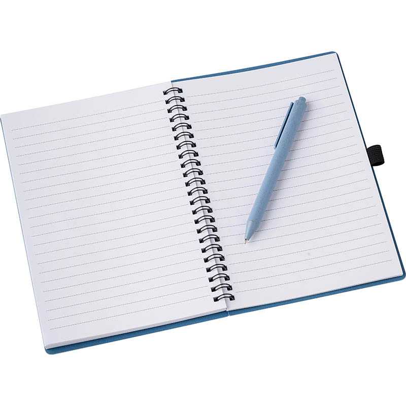 Poznámkový blok so 70 čistými listami a hrebeňovou väzbou v kartónových doskách, vrátane guľôčkového pera v rovnakej farbe z recyklovaného papiera s modrou náplňou.