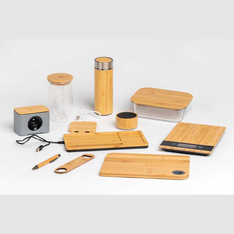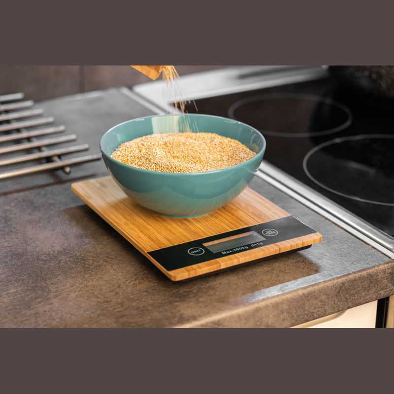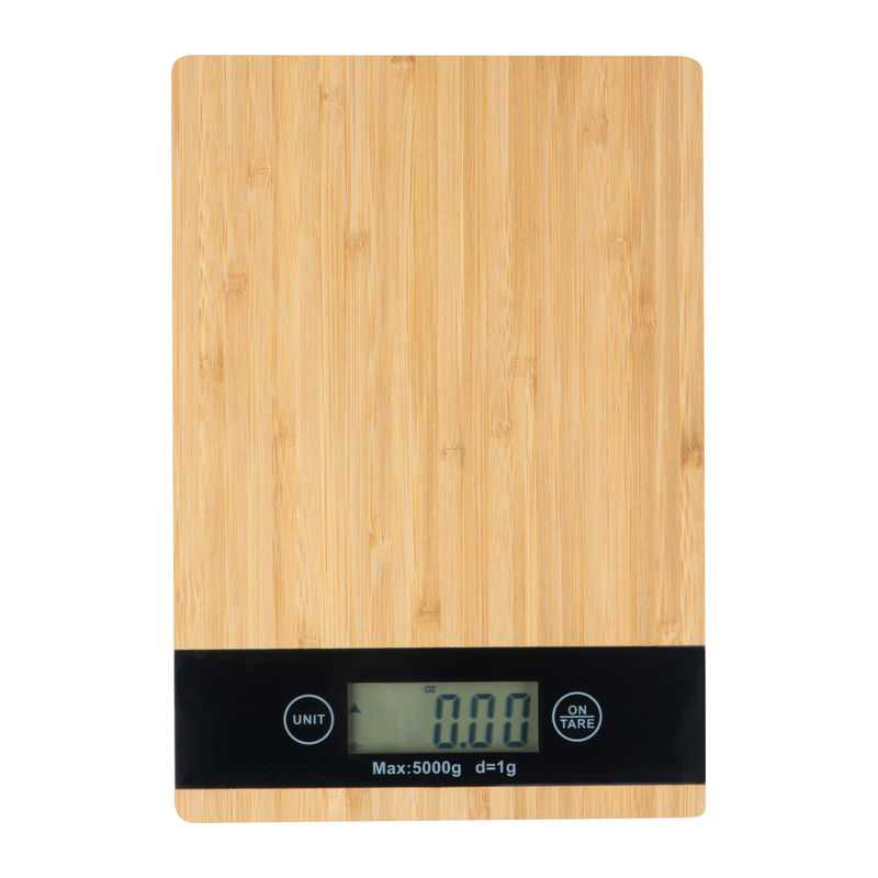 Kuchynská váha s bambusovým povrchom a čiernym digitálnym displejom. Maximálna nosnosť 5 kg, možnosť zobrazenia v kg / g / oz / ml, s 1g presnosťou.