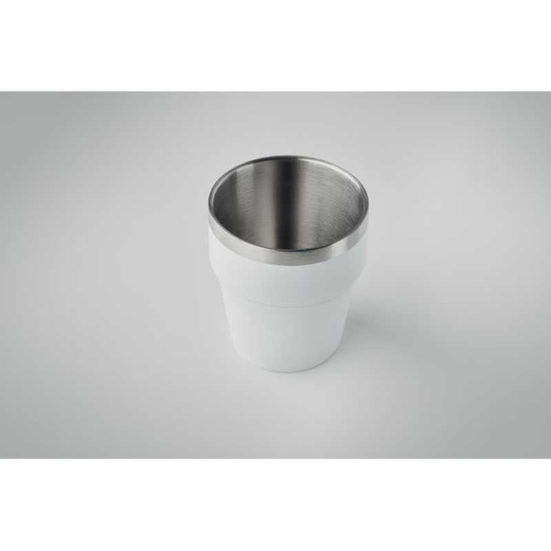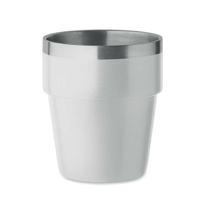 Dvoustěnný pohárek z recyklované nerezové oceli (90 % recyklované nerezové oceli a 10 % nerezové oceli). Objem: 250 ml.