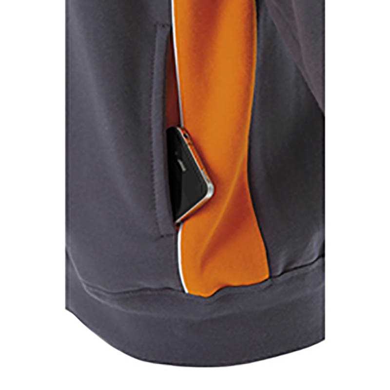 rovný strih s bočnými švami, celozapínací reverzný špirálový zips, kapucňa s podšívkou, na stiahnutie šnúrkou, vnútorná časť priekrčníka začistená páskou, nakladané vrecká v štýle klokanky, dolný lem a manžety rukávov z rebrového úpletu 2:2 s 5 % elastanu
