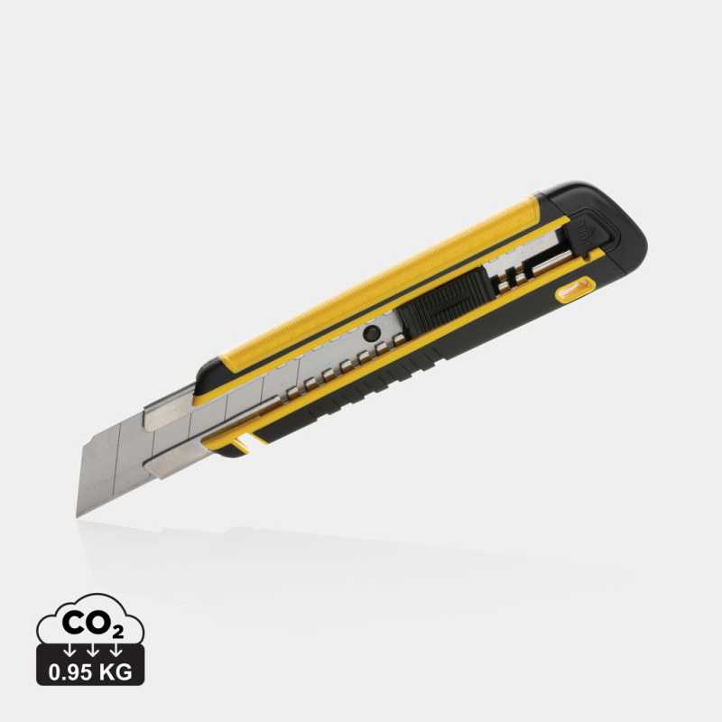 Opakovane plniteľný nôž s odlamovacou čepeľou. Pogumovaný soft grip obal vyrobený z RCS recyklovaného ABS a TPE, čepeľ z SK4 nehrdzavejúcej ocele. RCS (Recycled Claim Standard) je globálny štandard, ktorý umožňuje overiť použitie recyklovaného materiálu v produkte naprieč celým dodávateľským reťazcom. Celkový podiel recyklátu podľa váhy produktu: 41%. Čepeľ je možné po stupení jednoducho o diel zalomiť a získať tým opäť ostrú časť. Po využití celej čepele ju možno jednoducho vymeniť a nahradiť novú. Balenie obsahuje 1 nasadenú a 2 náhradné čepele. Balené v FSC® kraftovej darčekovej krabičke.