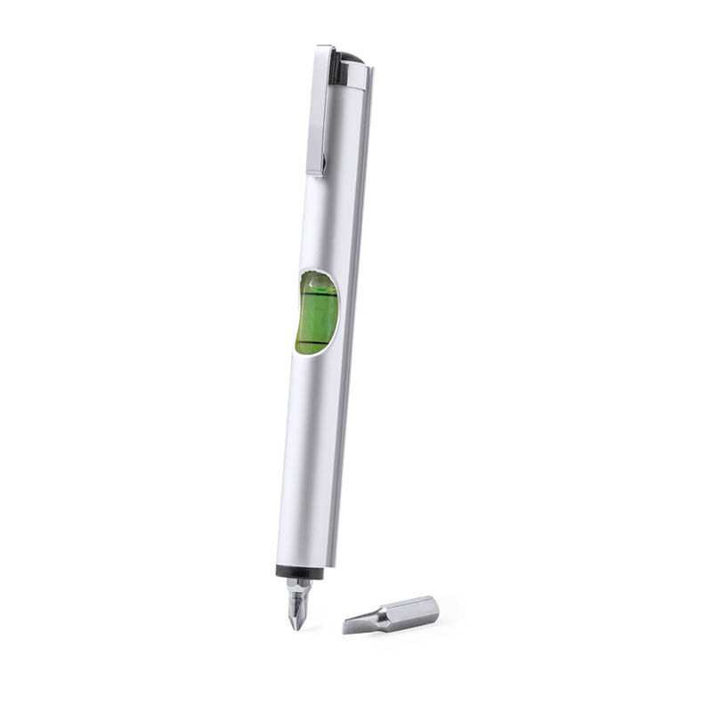 NOVINKA 2025. Multifunkční nástroj ve tvaru pera s baterkou, z recyklovaného hliníku. Obsahuje 3 ploché a 3 křížové šroubovací bity. 4 knoflíkové baterie LR41 jsou součástí balení.