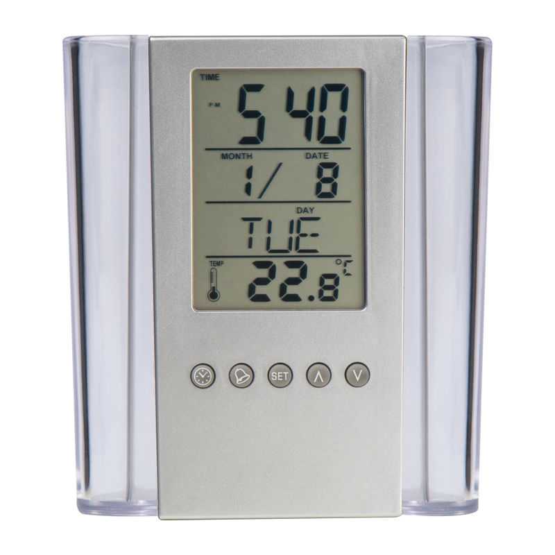 Transparentný akrylový držiak na perá so zobrazením času, dátumu a teploty, aby ste mali všetko pod rukou.