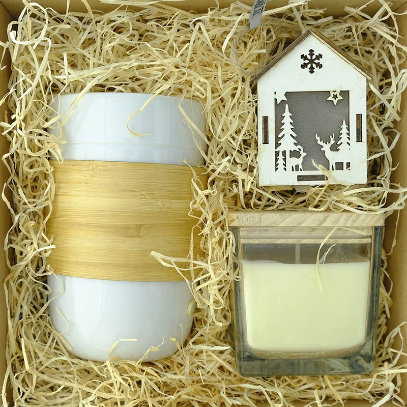 Darčeková krabica > prírodná / prírodná > 21x21x10 cm, Keramický hrnček 500 ml > biela, Sviečka zo sójového vosku > béžová, Vianočná dekorácia > hnedá (wood)