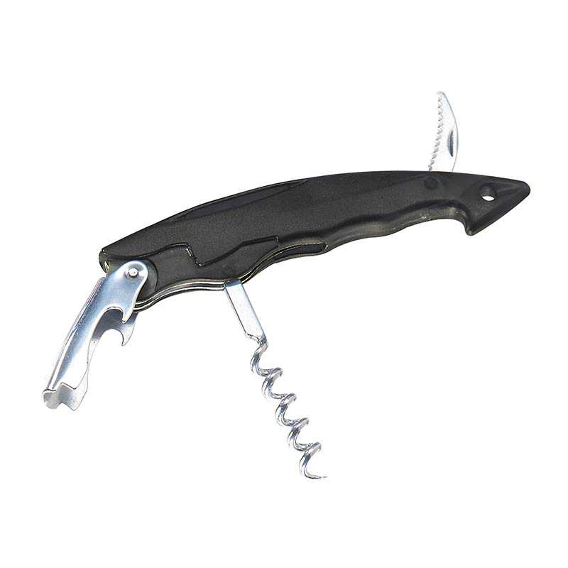 Bottle opener with corkscrew and foil cutter, transparent plastic with metal tools