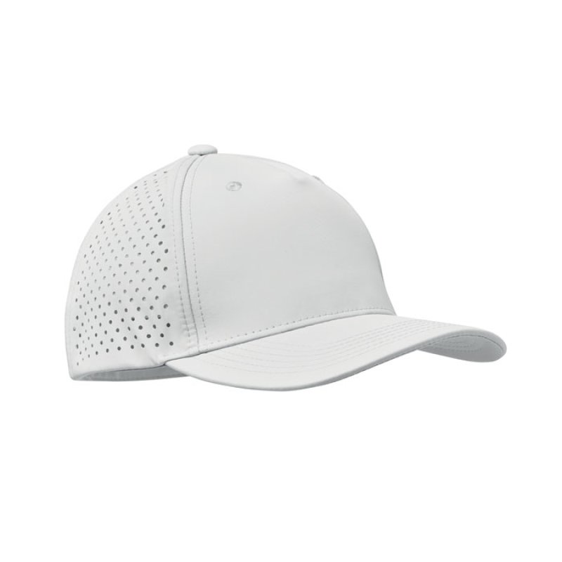 NOVINKA 2025. Pětipanelová polyesterová funkční čepice s nastavitelným zapínáním na suchý zip a laserem perforovanými otvory a 2 prošitými očky v odpovídající barvě. Vložka je rychleschnoucí, odpuzuje pot a vodu. 130 gr/m2