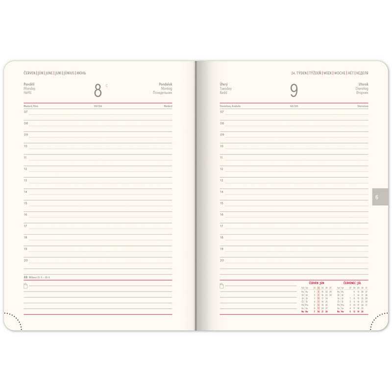 a Slovenskej republiky • miesto pre osobné údaje • textilná záložka • perforované rožky • priestor na poznámkyRozsah: 352 strán. Rozmer: 15 x 21 x 3 cm. Hmotnosť: 0,38. Papier: 70 g/m2 krémový papier. Väzba: tuhá knižná s gumičkou a pútkom na ceruzku. Kalendárium: 6 jazyčné (CZ, SK, GB, DE, HU, RU) .