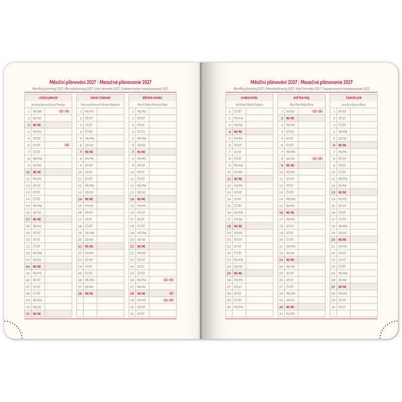 Zaujímavý dizajn týždenného diára tvorí kombinácia dvoch farieb poťahového materiálu. Diár je v pevnej väzbe s prednou penovou doskou, kovovou nálepkou roku, farebnou lacetkou, ozdobným kontrastným prešitím. Slovenské prehľadné kalendárium.Kalendárium: SK/CZ-UK-DE-RU. Rozsah: 160 listov. Formát: 20,2 x 26 cm.