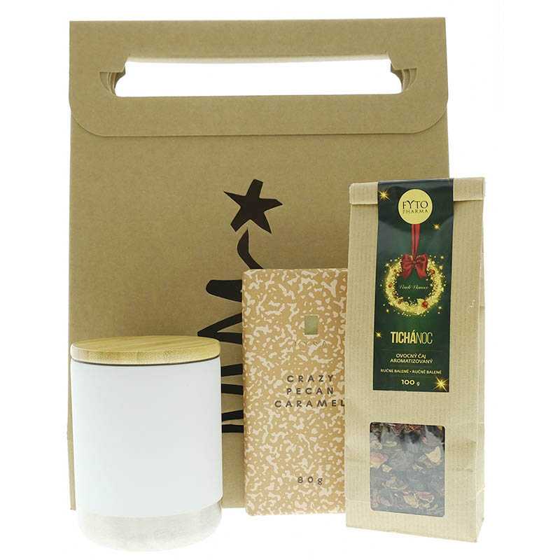 Tichá noc 100 g sypaná ovocná zmes, Čokoláda Crazy Pecan Caramel 80 g, Pohár z nerezovej ocele 370 ml. Darčeková taška 30x23x10 cm