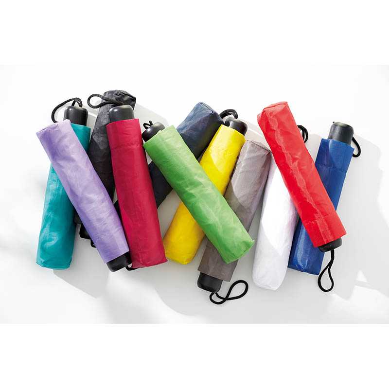 Polyester (190T), foldable umbrella with eight panels and Velcro fastening. Including nylon sleeve.