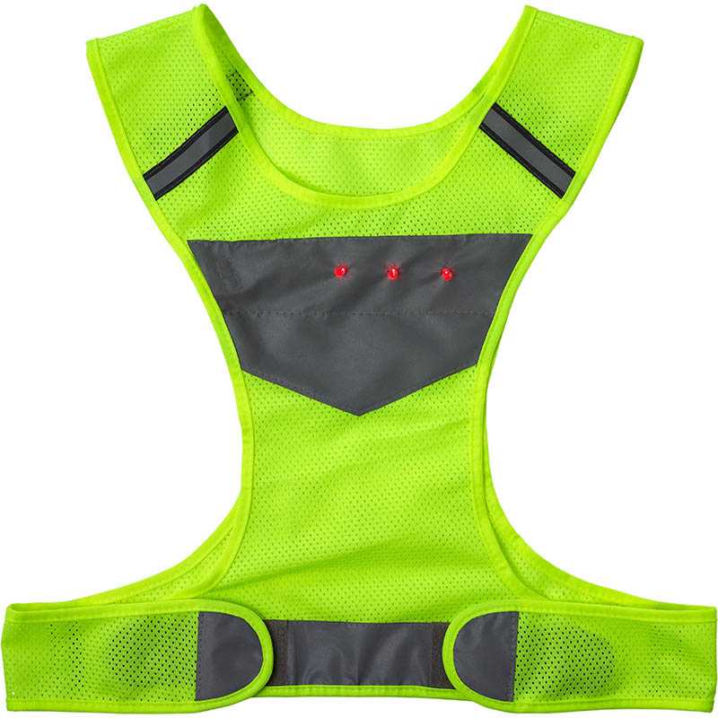 Nylon and polyester safety vest. The fluorescent mesh vest has reflective areas and three lights at the front and back. Batteries included. For promotional use.