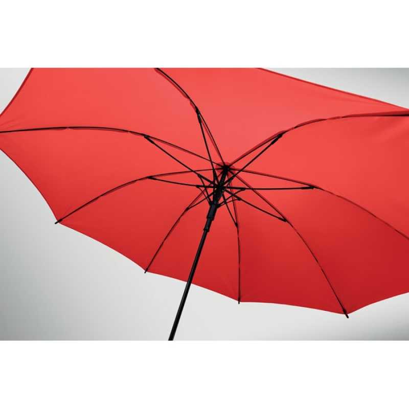 Polyester (170T) automatic umbrella with eight panels. Metal and fibreglass frame and EVA handle.