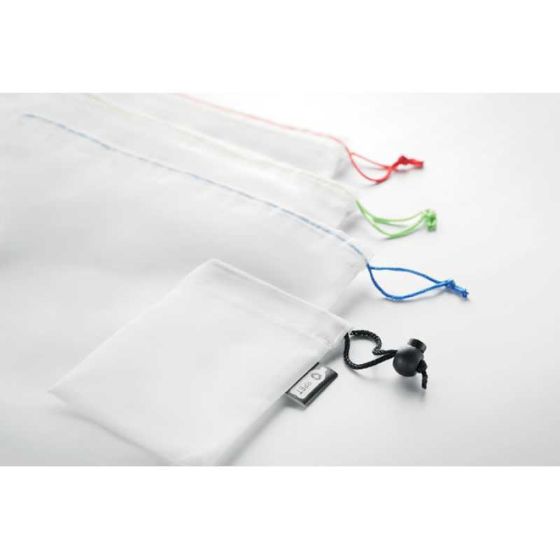 Sada 3 RPET sáčků v obale také z RPET. Opakovaně použitelné ovocné nebo zeleninové sáčky jsou alternativou pro plastové nákupní pytlíky. Uzavírání šňůrkou. Lze prát, bez BPA a bezpečné pro potraviny.