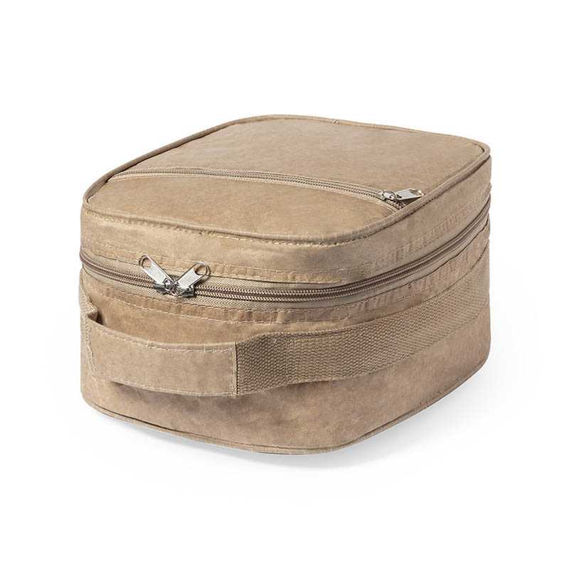 NOVINKA 2025. Nature line cooler bag made of recycled paper. Including two separate, zippered compartments, with metal pullers. Reinforced carrying handle and isothermal inside, with aluminum finish.