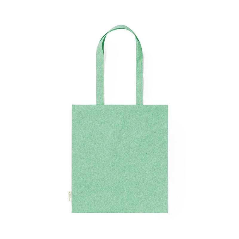 NOVINKA 2025. Bag made of recycled cotton material 140g/m2. GRS (Global Recycled Standard) certification, which guarantees the recycled origin of the material used to manufacture the product. Stitched finish, with 70 cm in lenght, reinforced handles, and available in a wide range of colours. Resistance up to 8kg, including recycled cotton emblem on label.