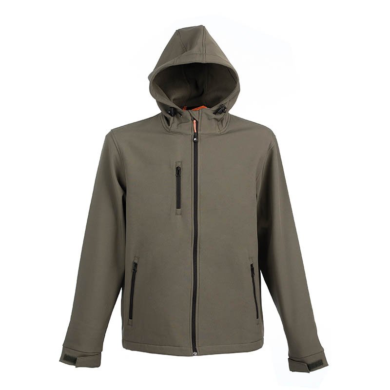 "Soft shell 2 layer jacket - 96% Polyester - 4% elastan - Waterproof - Hood with drawstring - Waterproof zippers - One chest pocket with zip - Two outside pockets with zip - Adjustable cuffs with Velcro - Drawstring at the bottom"