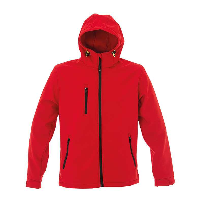 NOVINKA 2025. Soft shell jacket 3 layers - Waterproof 8000 mm/H2O - Breathability 1000 g/m2/24h - Inner layer in microfleece - Corded seams on sides and sleeves - Taped zippers - Two external pockets with zip - Reflective piping behind the collar - Internal fabric under the collar can be lifted for customization - Internal neck reinforcement tape with 100% Recycled polyester MAN 15 Pcs 280 g/m2 LADY hanger hook - Elastic fabric at the cuffs
