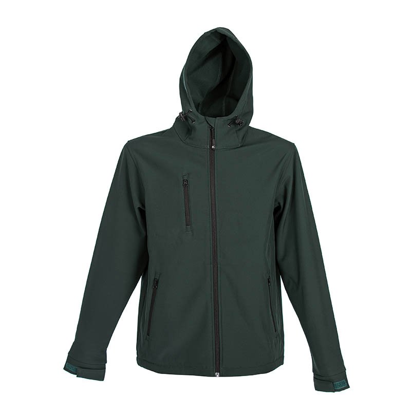 "Soft shell 2 layer jacket - 96% Polyester - 4% elastan - Waterproof - Hood with drawstring - Waterproof zippers - One chest pocket with zip - Two outside pockets with zip - Adjustable cuffs with Velcro - Drawstring at the bottom"