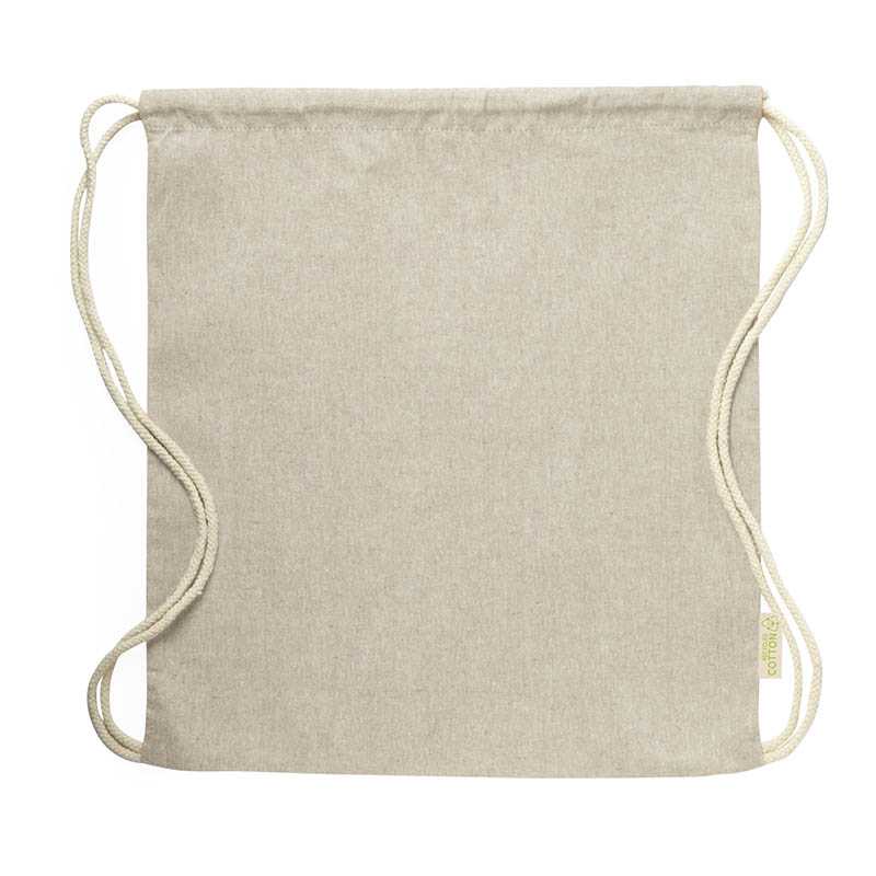 NOVINKA 2025. Drawstring backpack made of recycled cotton material 120 g/m2. The self-closing strings are also made of cotton and The base is in a natural colour to match the strings. Eco logo visible on the side label and available in a wide range of nature colours. Resistance up to 6kg in weight.