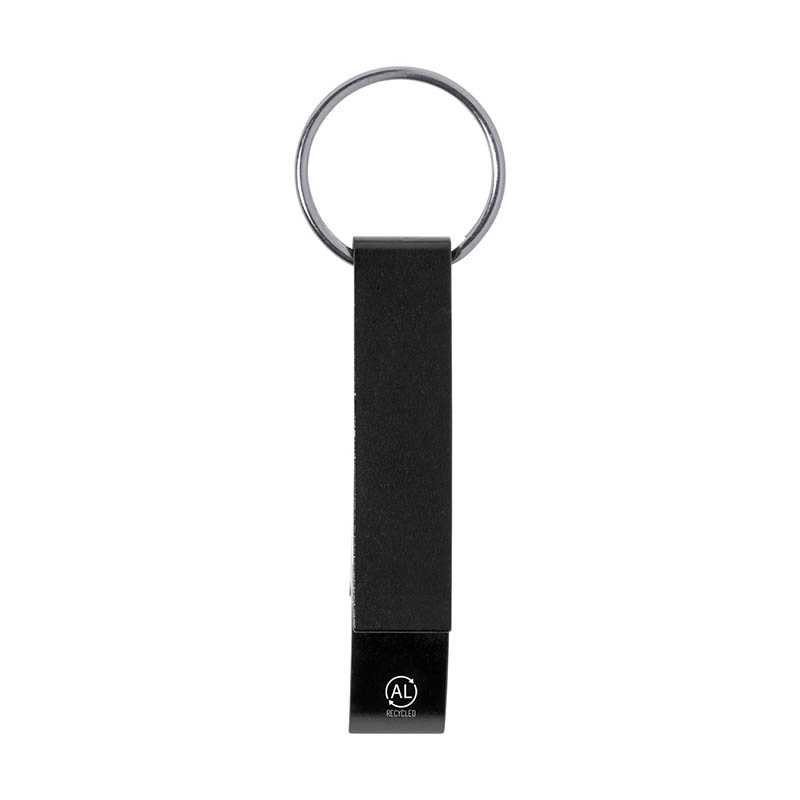 Otvárač na fľaše a konzervy z recyklovaného hliníka s kovovým krúžkom na kľúče.