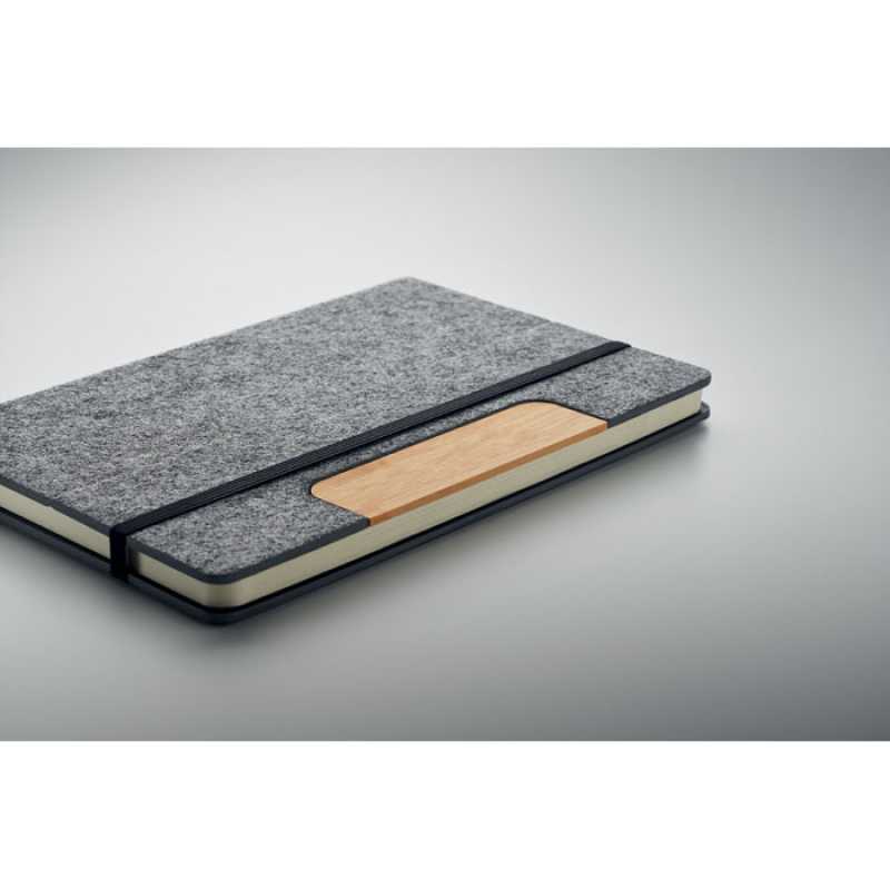 NOVINKA 2025. Notepad and ball pen set made of RPET felt and recycled Aluminium. Includes a hard covers notepad, made of RPET felt and natural cork, with 80 lined pages, elastic band closure, bookmark and a brown ball pen holder. In addition, it includes a recycled Aluminium ball pen with grip made of natural cork, push-button mechanism and blue ink. Presented elegantly in a gift box.RPET felt is the result of the combination of the recycling processes of plastic materials along with the millenary technique of felt manufacturing, resulting in an eco-trend material that, in addition to being of recycled origin, also becomes recyclable.